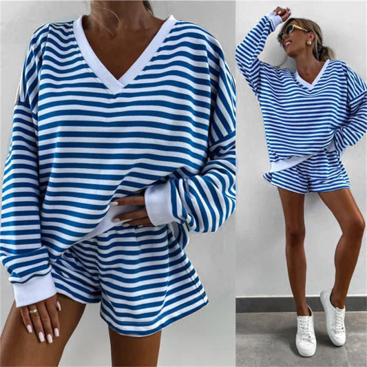 Kétrészes női ruha Csíkos V-nyakú Bő felső és rövidnadrág-TAB