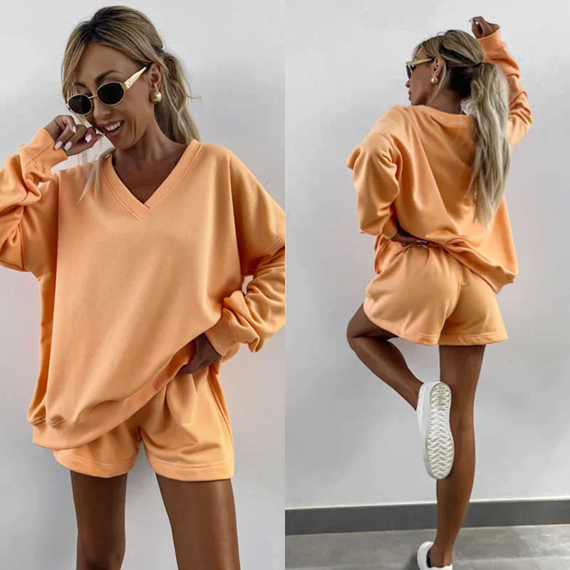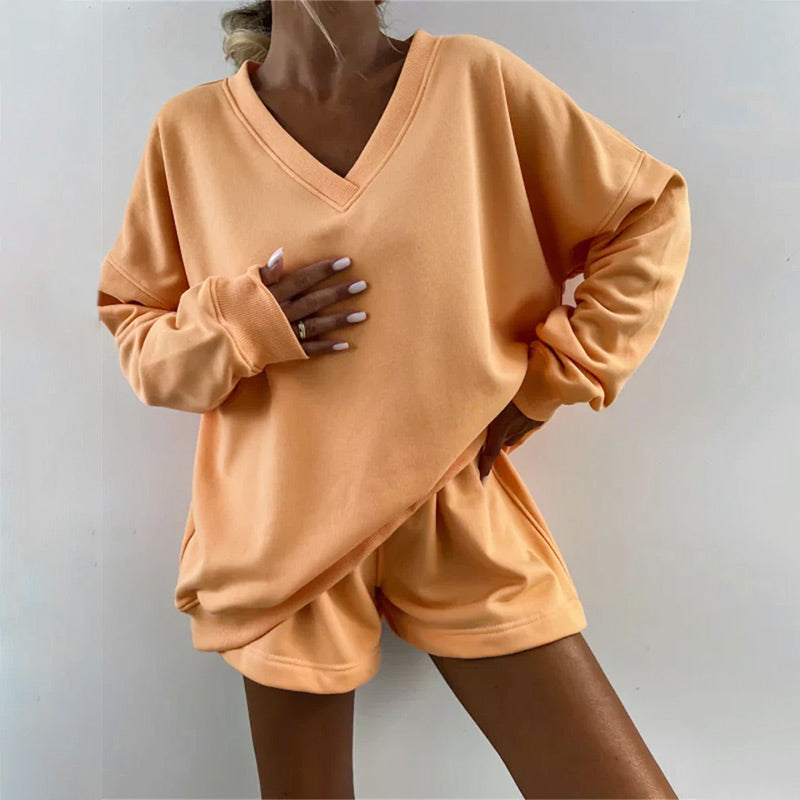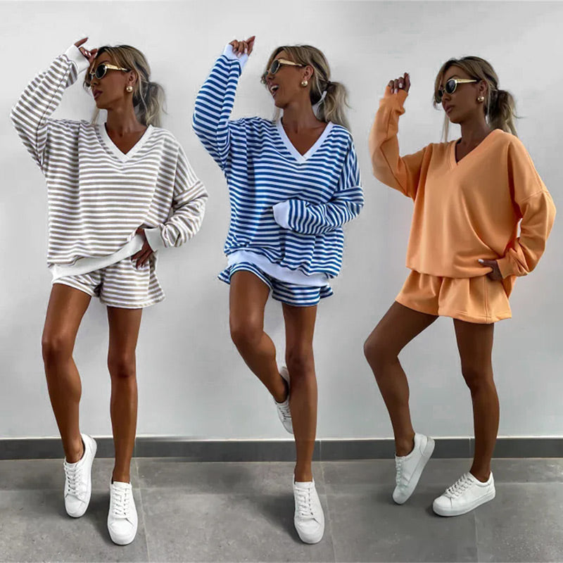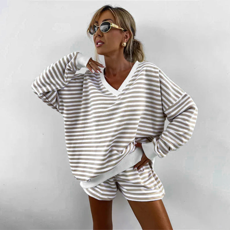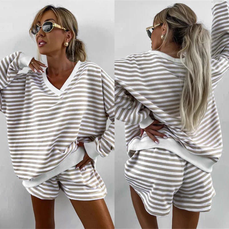 Kétrészes női ruha Csíkos V-nyakú Bő felső és rövidnadrág-TAB