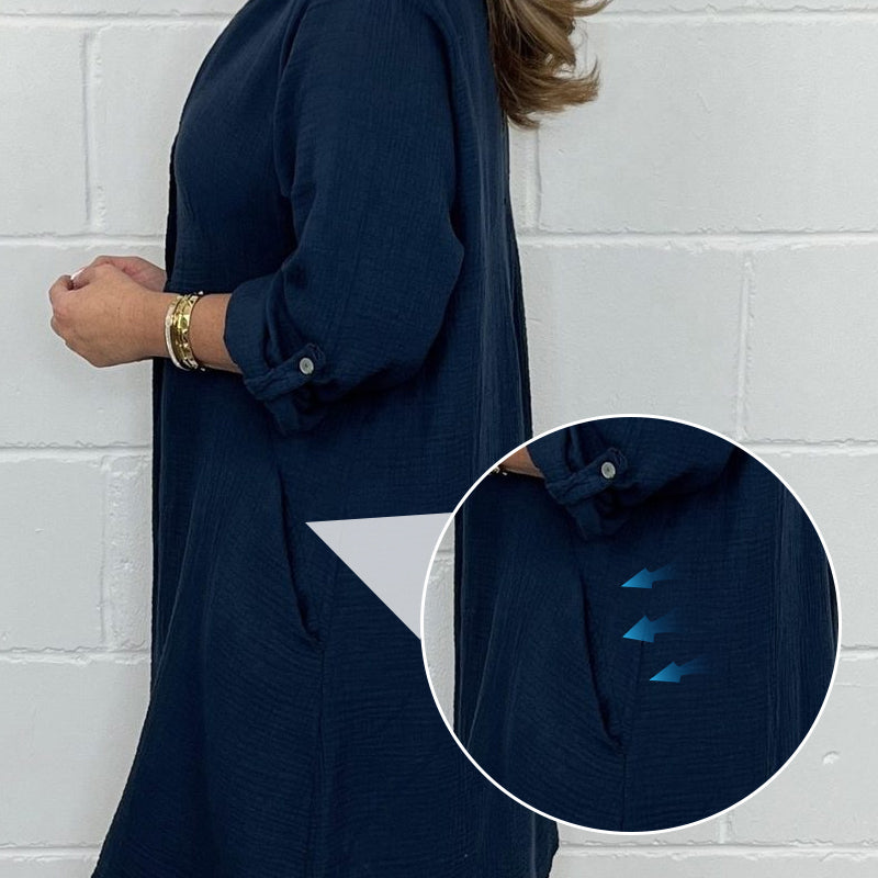 A csomag tartalmazza: 1 * plusz méretű ing ruha felhajtott ujjakkal és zsebekkel.